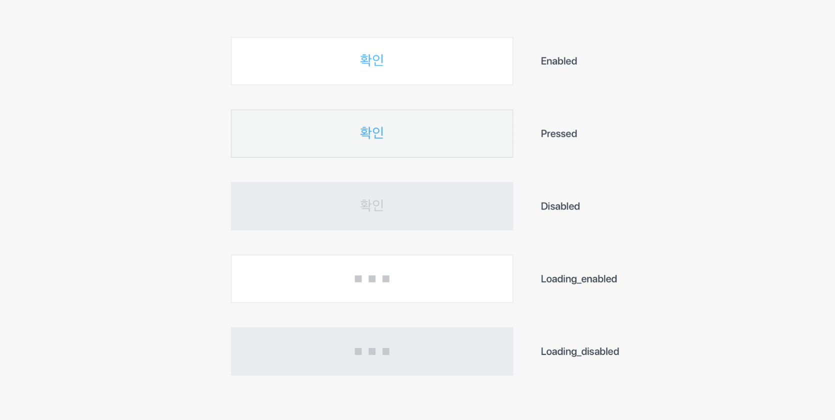 버튼은 가장 중요한 UI 컴포넌트 입니다. 사용자의 행동을 유도하거나 원하는 선택을 할 수 있도록 합니다. 또한 버튼에 따른 시각적 계층 구조에 차이가 있습니다. 버튼 스타일 및 쓰임새에 따라 크게 Button / Action Button / Text Button / Icon Button 등으로 분류합니다. 버튼의 상태는 크게 Enabled / Pressed / Disabled / Loading 으로 분류합니다.